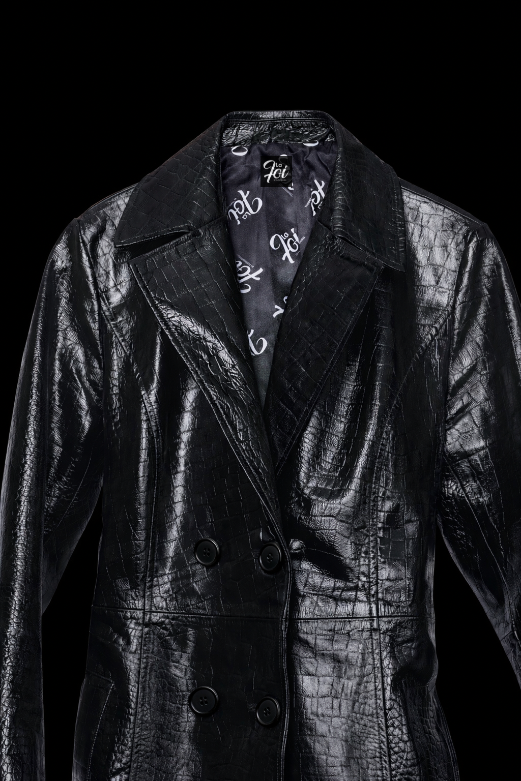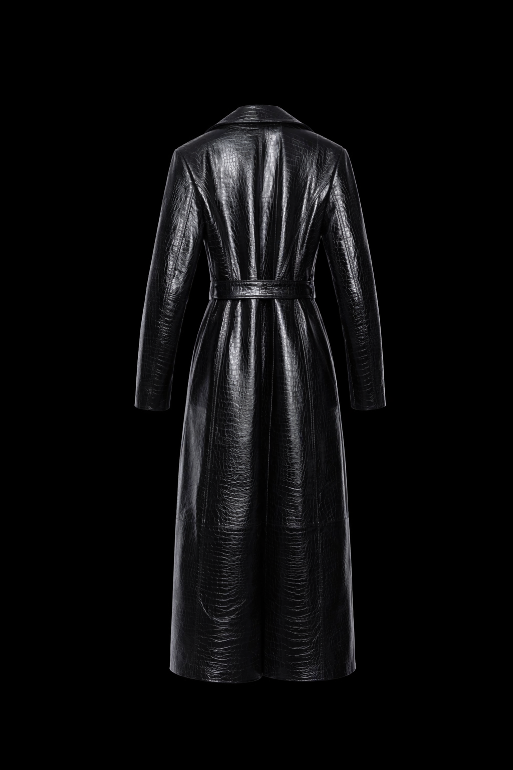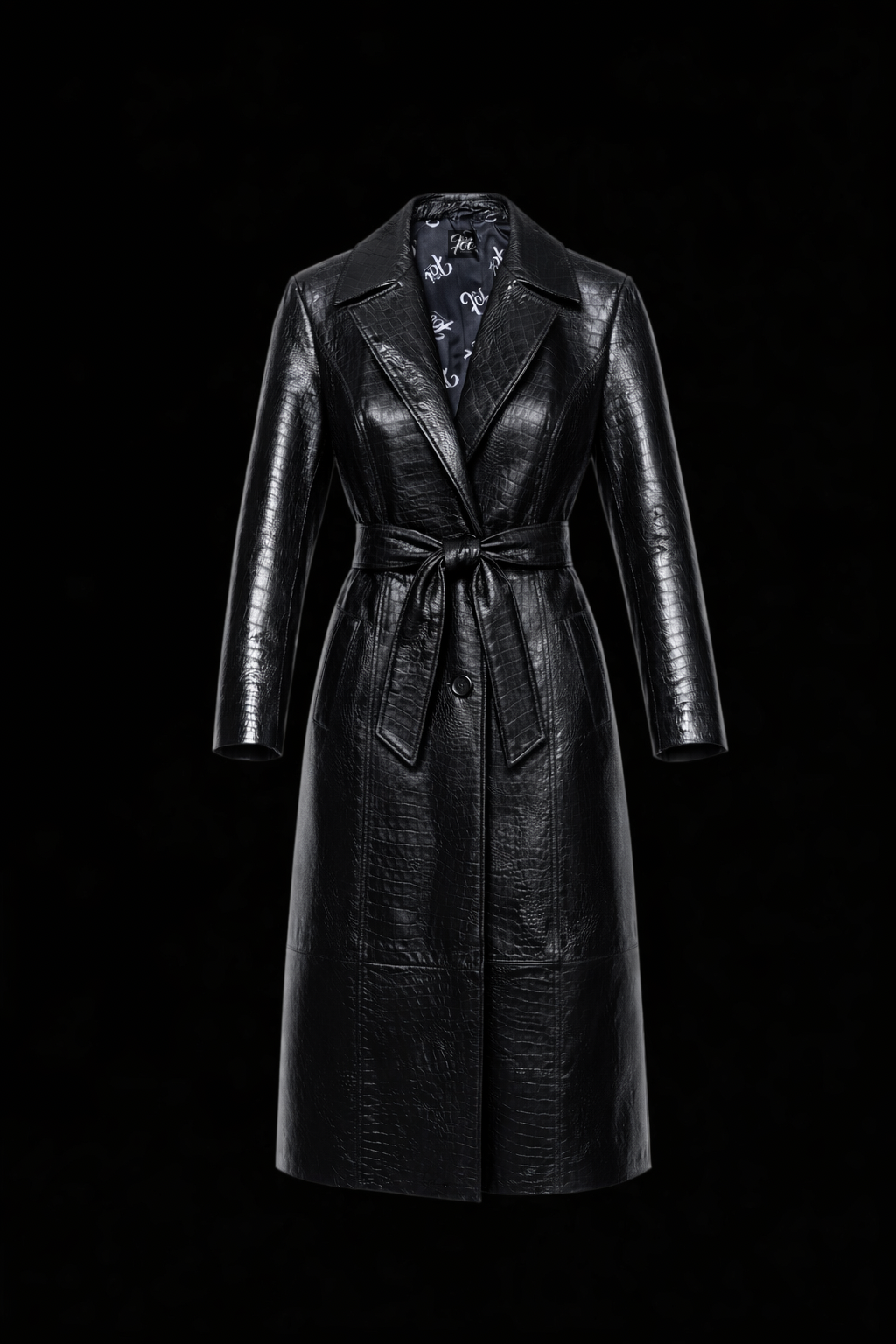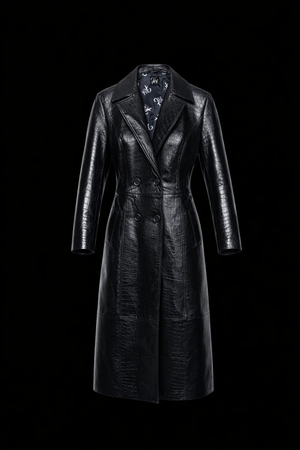 Designed with a structured silhouette and sleek, full-length finish. This trench features rich crocodile texture detailing that shines beautifully under light and elevates any outfit instantly. Finished with a double-breasted design and an adjustable belt to cinch the waist, this coat delivers elegance, power, and sophistication in one iconic look.